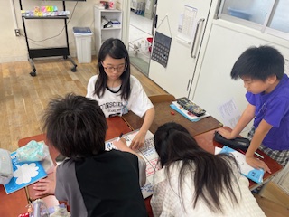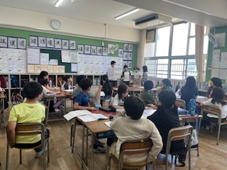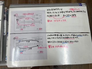 今日は、1,0.1をもとにして計算する方法と、2,10倍の数をもとにして計算する方法について、グループで考え、みんなに説明をしました。