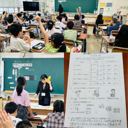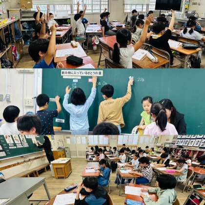 子ども達は、実際に砂糖を手に持ったり文房具の重さと比較したりしながら、砂糖の重さを体感していました。そして、身近な飲み物にはどれくらいの砂糖が入っているのかを予想しながら、楽しく学ぶことができました。