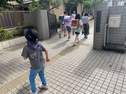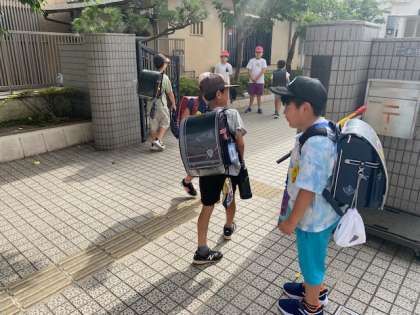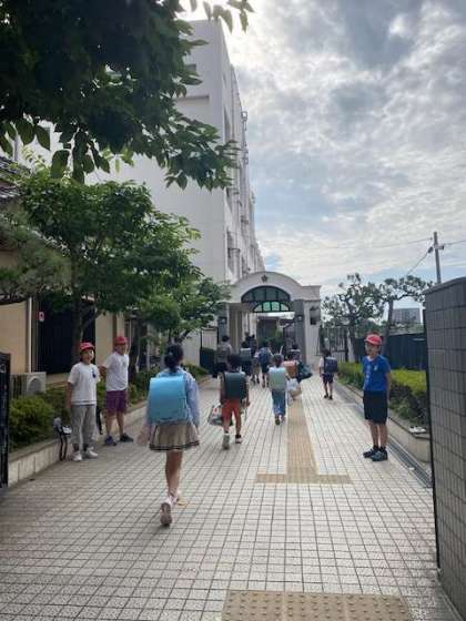 登校時の気温はすでに27度。「暑い」と言いながらも笑顔がたくさん見られました(^^)
