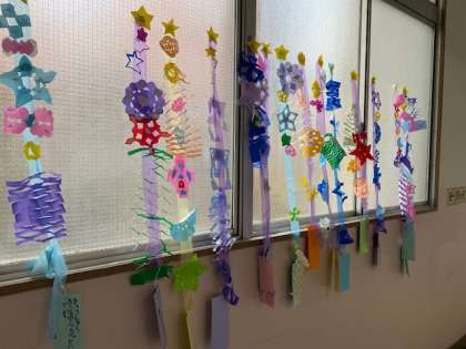 今日は、七夕。1年生は願いを込めて笹飾りを廊下に掲示しています。