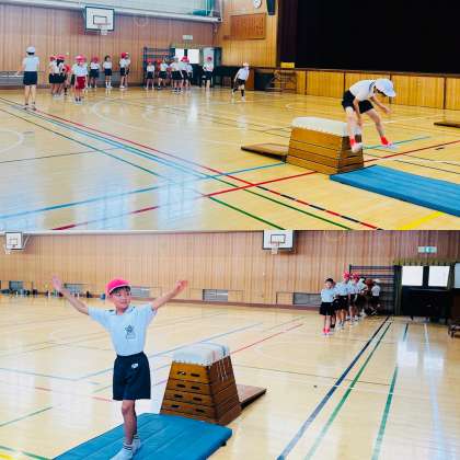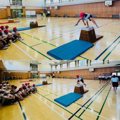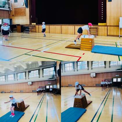 久しぶりの跳び箱学習です。最後の発表の時間には、「跳び箱から遠い位置に着地していてすごかった!」「着地した後、ぴったり止まれていた!」「脚がよく開いていて、空中姿勢がとてもきれいだった!」と、友だちのよかったところをたくさん見つけて伝えることができました。