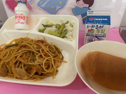 カレースパゲッティ グリーンアスパラガスとキャベツのサラダ 発酵乳
