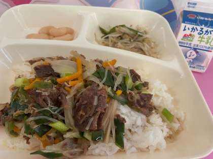 牛丼 もやしとピーマンのごまいため 大福豆の煮もの