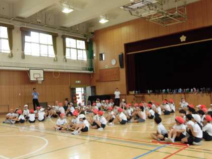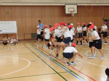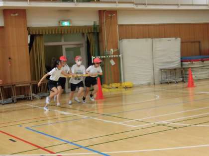 5年生の学期の締めくくりと言えば「学年集会」。今日は、運動系お楽しみ会といった内容でした。各クラスからしたい団体競技を出し合い、各クラスの代表の子たちが進行していました。