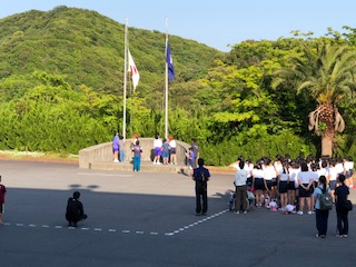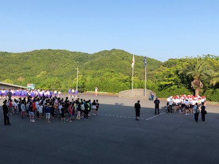 1日目の夕べのつどいの様子です。ともに宿泊している皆さんとの顔合わせの会です。代表者が学校紹介、これまでの活動報告やこれからの活動について話しました。この後、お楽しみの夕食とキャンプファイヤーです。