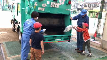 係の方から説明を聞いたあと、あらかじめ用意しておいたごみが入った袋を、パッカー車に投入させてもらいました。ごみの分別クイズや作業服の着衣体験などもさせてもらいました。