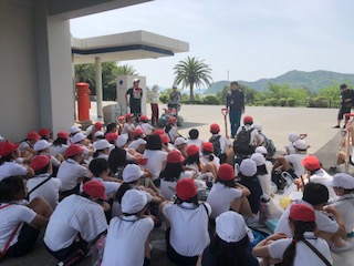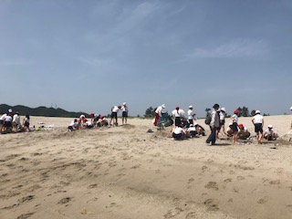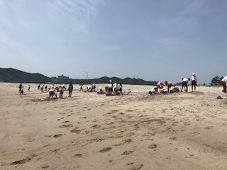 「砂の造形」の活動の様子です。班のみんなで協力して作り上げました。さて、コンテスト優勝チームは?