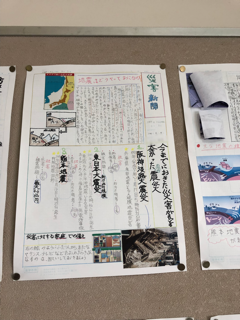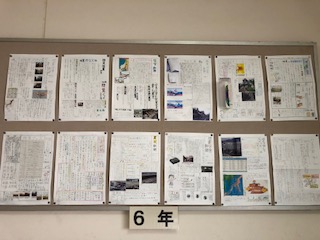 6年生の校内掲示板には、自然体験学習の事前学習として調べた、地震や災害などについてまとめた新聞が掲示されています。どれも分かりやすく、丁寧にまとめられています。