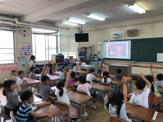 →C-NETで来ていただいている、ネイティブスピーカーのダニー先生と担任での外国語活動です。元気よく、意欲的に活動できました。授業の後は、職員室まで「グッドバーイ、バイバイ、またねー」と先生に声をかけていました。