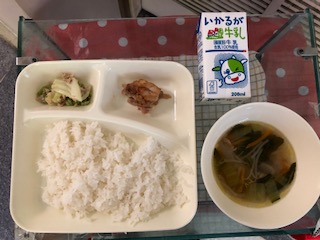 鶏肉のオイスターソース焼き、中華スープ、ツナと野菜のごまいため、米飯、牛乳