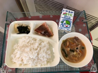 赤魚のしょうゆだれかけ、みそ汁、わかたけ煮、米飯、牛乳