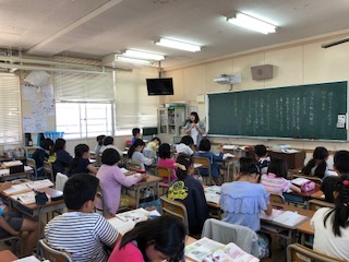 教科書の題材をもとに、自分の意見を書いて、班のみんなと意見交流をしていました。発表する児童の意見も素晴らしく、とても活発に意見交換が行われていました。さすが6年生!と思わせる授業でした。