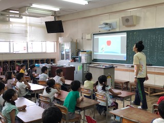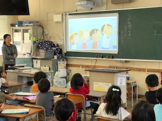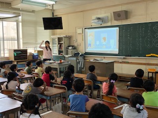 全学年で、火曜日と金曜日の大江タイム(9時30分から9時40分)に「外国語活動」を行っています。