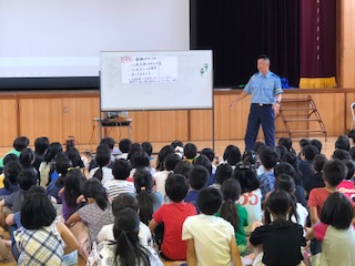 →低学年と中学年では、交通ルールや危ない場所での注意点などをクイズ、映像を交えて教えていただきました。特に、交差点での横断の仕方については丁寧に説明してもらいました。「自分で考えて、しっかりと正しい判断すること」がとても大事であることがわかりました。これからも交通ルールを守って、安全に過ごせるようにしましょう。