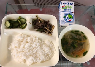 チンジャオニューロウスー、ハムと野菜の中華スープ、きゅうりの辛みづけ、米飯、牛乳