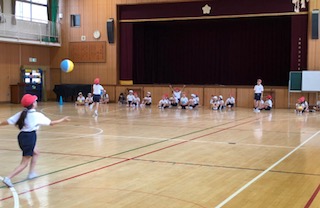→ボールに親しむ運動を、チーム対抗で行なっていました。とても盛り上がっていました!