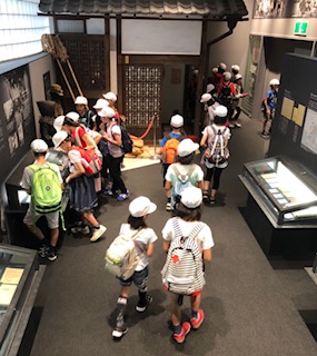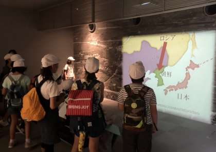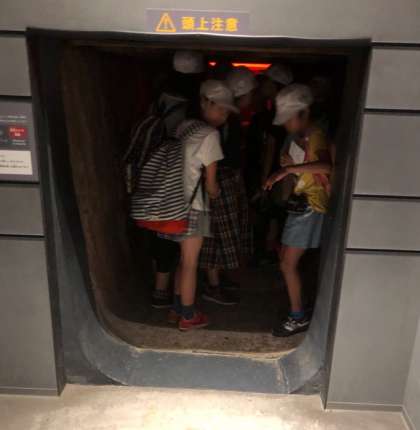 次の目的地のピース大阪に着きました。こちらも班ごとに活動しています。戦時中の人々のくらしや、空襲による被害状況、防空壕の体験など、普段の生活では知ることができない貴重な体験をしています。また、平和へのメッセージを書く児童も見られました。平和学習としての取り組みもできています。