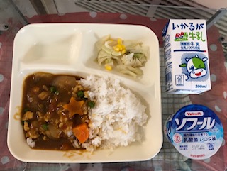 チキンカレーライス、キャベツとコーンのサラダ、ヨーグルト、牛乳