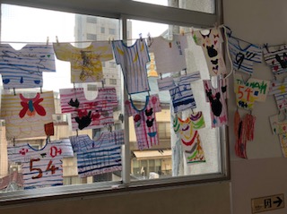 カラフルなシャツの作品が飾られています。