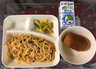 シーフードトマトスパゲッティ【個別対応・えび】、グリーンアスパラガスとコーンのサラダ、はっ酵乳、1/2パン、牛乳