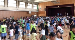 集会委員会の児童による、本日の全校集会は「フラフープぬけ」ゲームでした。班の仲間と協力し、上手にフープの中をくぐりぬけていました。低学年の児童に優しくアドバイスする高学年の児童の姿が印象的でした。
