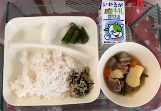 豚肉とじゃがいもの煮もの、オクラの梅風味、ツナっ葉いため、米飯、牛乳