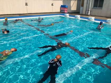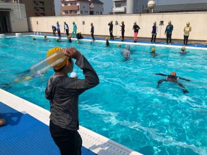 6年生は体を水に慣らした後、水着の上から長袖、長ズボンを着込んで、再びプールの中に入りました。服を着たまま体を水に浮かべることや、水の中の溺れている人にプールサイドからペットボトルを投げ入れて救助すること、服を着たまま泳ぐのは難しいことなど、実際に体験してみてたくさんのことが分かったと思います。授業後には「服が重くて泳ぎにくかった」「浮くのは難しい」などの感想が聞かれました。子どもたちにとって貴重な経験になったと思います。