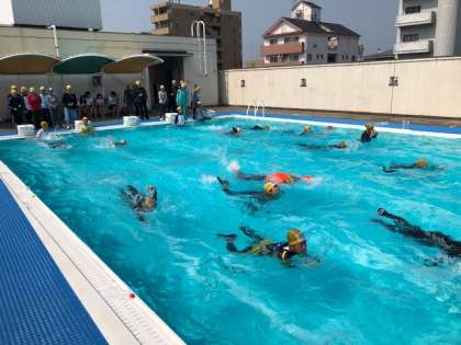 大江小学校では、水の事故から自分の命を守る取り組みとして、今年度より着衣泳の学習を実施することにしました。今日は3〜6年生を対象に取り組みを進めました。