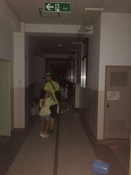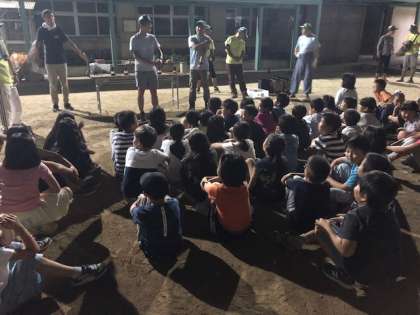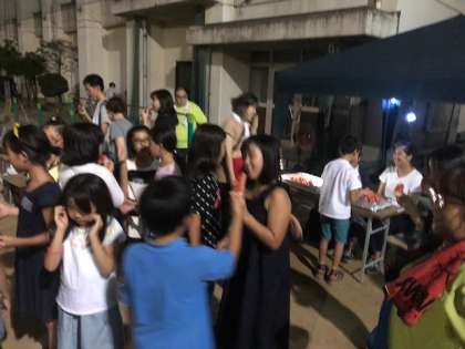 テントを設営し終えた後、夜の校舎を巡る肝試しをしました。青少年指導員の方から諸注意(怪談話?)を聞いた後、グループ毎に真っ暗闇の校舎へ…いろんな仕掛けがいつの間にかされていて、子どもたちの絶叫が校舎に響きわたりました。かなり怖がっていた子どももいましたが、ゴールに待っていた美味しいスイカで一安心することかできました。