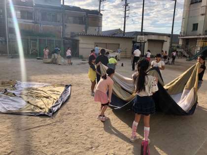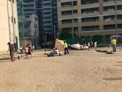 おはようございます。校庭でのテント泊はよく寝られたかな?かなり遅くまで起きていた子どももいたようですが、朝は5時前にはほとんどの子どもが動き出していました。