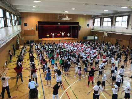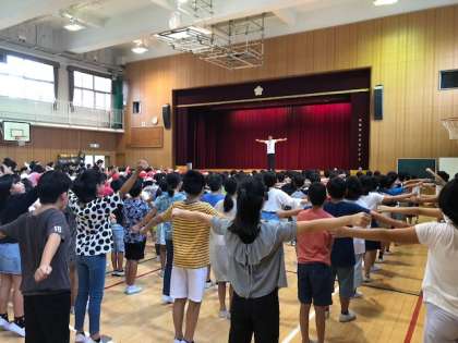 今日の児童集会は運動会に向けて、ラジオ体操の練習をしました。体操の動きのポイントを確認した後、体操係の児童が前に立ちラジオ体操第一の前半部分をしました。