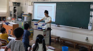 →「どちらがおおい」の学習をしていました。実際に二つの形の違うペットボトルの水のかさを比べてながら学習を進めていました。児童はとても意欲的でした。