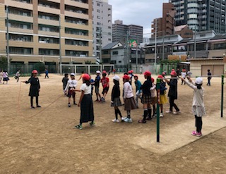 →児童集会で取り組んだ「大なわとび」をして遊んでいました。複数の学年が一緒になって遊んでいて、上の学年の児童が優しくアドバイスしたり応援したりする姿が見られました。