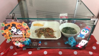 ピリ辛丼、中華スープ、黄桃(缶)、米飯、牛乳