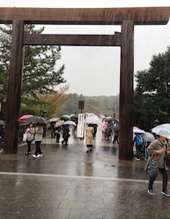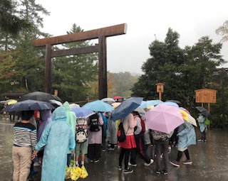 午前11時半に、伊勢神宮に到着しました。雨具をしっかり準備、身につけて出発しました。