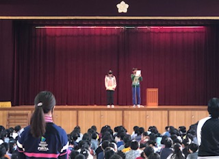 →校長先生のお話、各種表彰、委員会からのお知らせ、朝会当番の先生からのお話がありました。今週は読書週間です。図書委員会の取り組みも活用して、積極的に読書をしましょう!