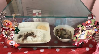 卵どうふ、豚肉とさといもの煮もの、おかかなっ葉、米飯、牛乳