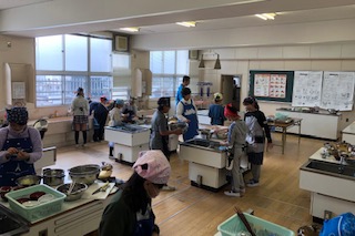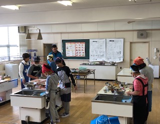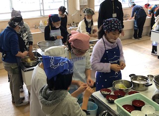 →5年い組では、調理実習を行いました。具だくさんのみそ汁とご飯を作りました。煮干しからだしをとって、丁寧に食材を切っていました。明日は、ろ組が調理実習に取り組みます。