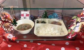 鶏肉の甘辛焼き、みそ汁、きくなとはくさいのごまあえ、米飯、牛乳