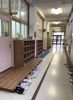 →保健室にて発育測定が行われています。きちんと上靴を並べて、静かに行われています。