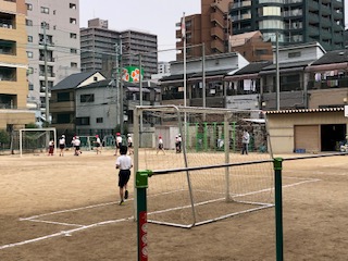 →運動場にてサッカーの試合を行なっていました。いいプレーには「ナイス!いいよ。」、ミスをしても「ドンマイ!つぎつぎ。」と声を掛け合う姿がたくさん見られました。