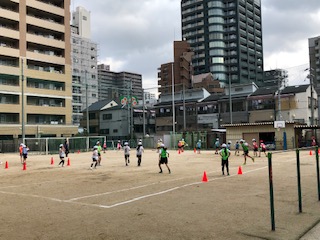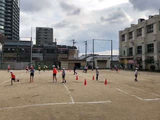 →運動場にて体育の授業が行われていました。しっかりと声かけをしながら、協力して活動をしていました。