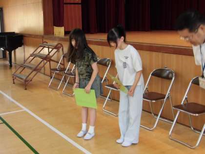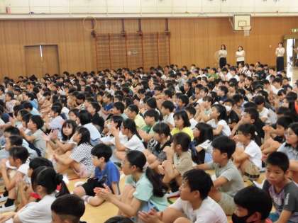 校長先生から4人の転入生が紹介されたあと、6年生にルワンダ共和国からの感謝状と3年生の2人にウィズスマイル賞が贈られました。