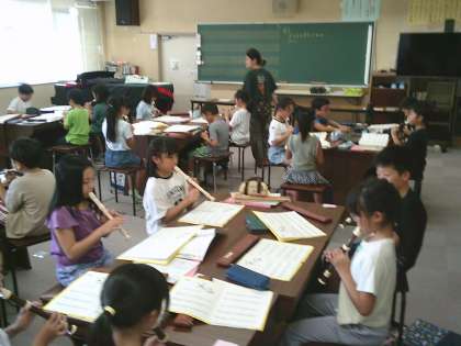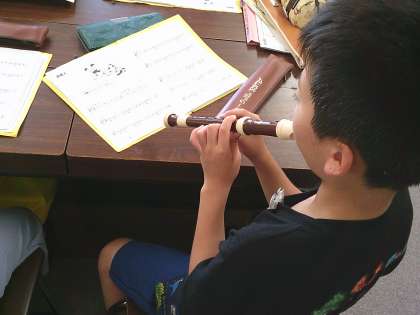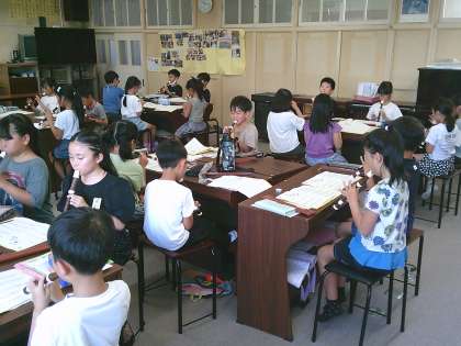3年生の音楽では、リコーダーを使って曲に合わせてタンギングの練習を行っていました。シの音だけの曲、シとラだけ使う曲など、吹き方を意識して吹いていました。