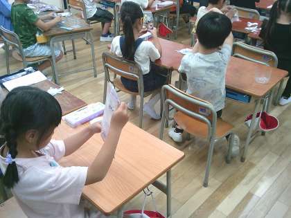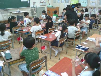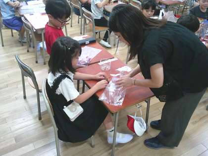 1年生の図工では、あさがおの絵を描いていますが、今日は、採取した花びらをビニル袋に入れ、そこに水を足して色水を作っていました。