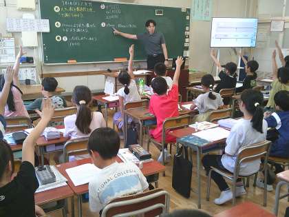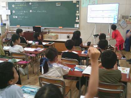 自分の考えを、はじめは近くの人と話し合い、そして全体の場で発表します。モニターに写しだされた数直線に、出題された大きな数を指示棒で示していました。