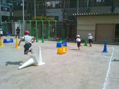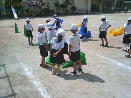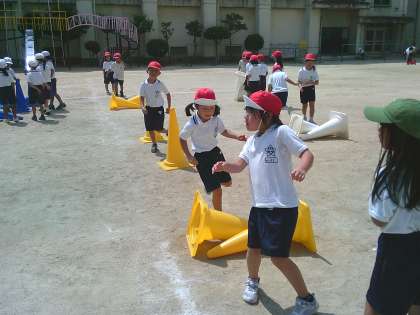 1年生の体育では、与えられたコーンを使って、自分たちでコースの設定を考えて、コーンを飛び越えたりジグザグに行ってみたりして走っていました。