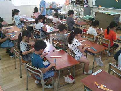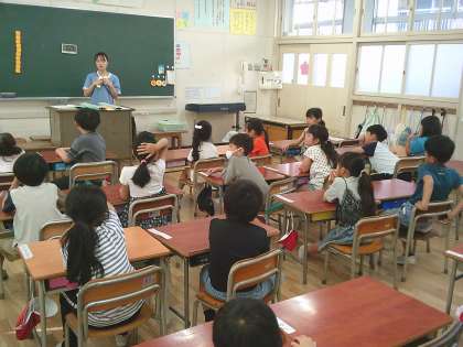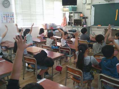 1年生の教室をのぞいてみると、算数ブロックを片付けているところでした。子どもたちがブロックを片付け終わり、次は、先生の分。そこで、「5つ片付けるといくつ残っているかな?」との問いかけ。そこからひき算の学習へとつながっていきました。