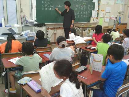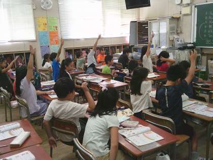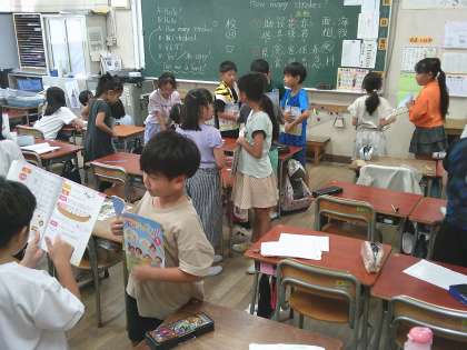 3年生の外国語活動では、漢字当てクイズを英語で行っていました。はじめは、先生が先生が見本を見せ、友だちどうし、漢字の当て合いを英語でチャレンジしました。