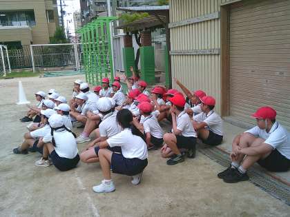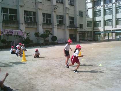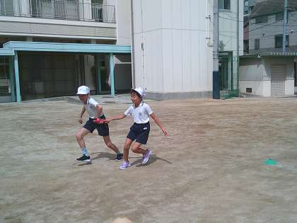 4年生の体育では、リレーのバトンパスの練習に取り組みました。バトンパスをするエリアのことを「テイクオーバーゾーン」と言うことも知り、バトンパスをするルールをふまえて競走しました。
